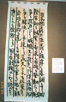 I first learned of Article 9 in a visit to the Kyoto Museum for World Peace, Ritsumeikan University. On the wall hangs a beautifully knit tapestry banner of Article 9, which reads: