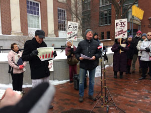 Inset Photo: Ben Cohen of Ben and Jerry’s speaks at an anti F-35 rally in Burlington, VT, on Jan. 19, 2018. The rally was held to announce we had enough signatures to place a question on Burlington’s March ballot which asked, in part, to cancel the planned basing of the jets. The ballot item won with 55% of the vote but it was ignored by the mayor. Photo by Robin Lloyd.