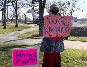 The group planted WILPF yard signs around the roundabout and carried signs highlighting issues such as homelessness, military overspending, and the soon-to-be-in-force Treaty on the Prohibition of Nuclear Weapons. They waved madly at passing cars.