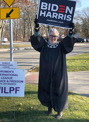 Denied our customary opportunity to hold an Inaugural Ball in honor of the new president, the Cape Cod Branch of WILPF decided to host instead an “Inaugural Ball Stand-out” on the afternoon of January 20th. Despite the bitter cold, a small dedicated crew donned our ball gowns and elbow-length white gloves (sadly covered up by warm coats and hats) and gathered at a roundabout in downtown Hyannis.
