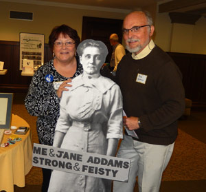 Another Strong Feisty Woman, Jane Addams, posed for photos. And, throughout the evening, the Raging Grannies led everyone in song. Lyrics by branch member Jan Hill honored the two winners and addressed the issues they continue to fight for.
