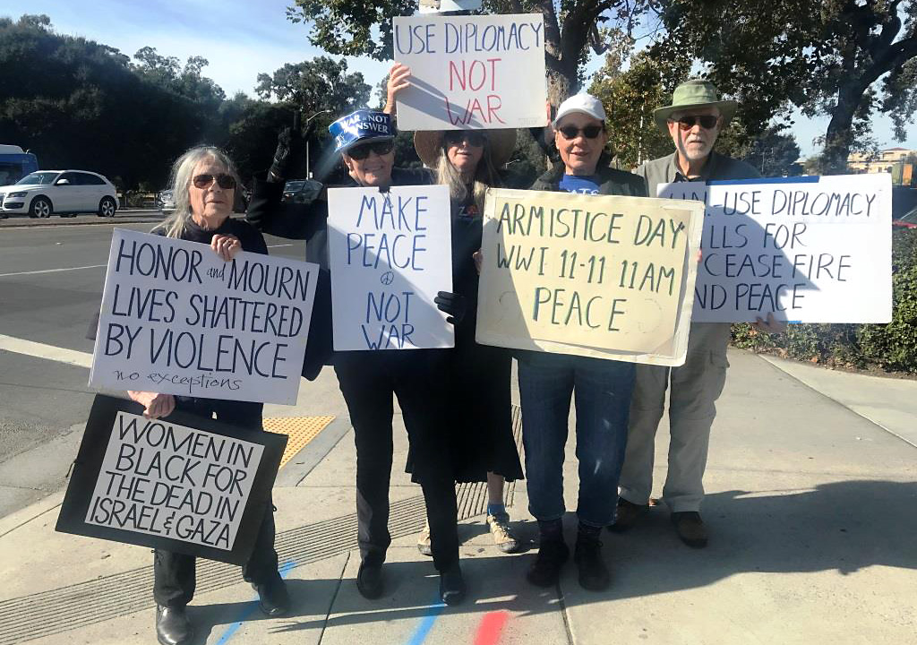 Members of the Peninsula/Palo Alto (CA) branch of WILPF holding some of the signs they have been showing to thousands of passing cars during their weekly vigil at a busy intersection in Palo Alto, CA. They have been calling for a ceasefire in the Ukraine-Russia war since March 2022 and for one in the Gaza-Israel war since mid-October 2023. Photo by Cherrill Spencer, used with her permission.