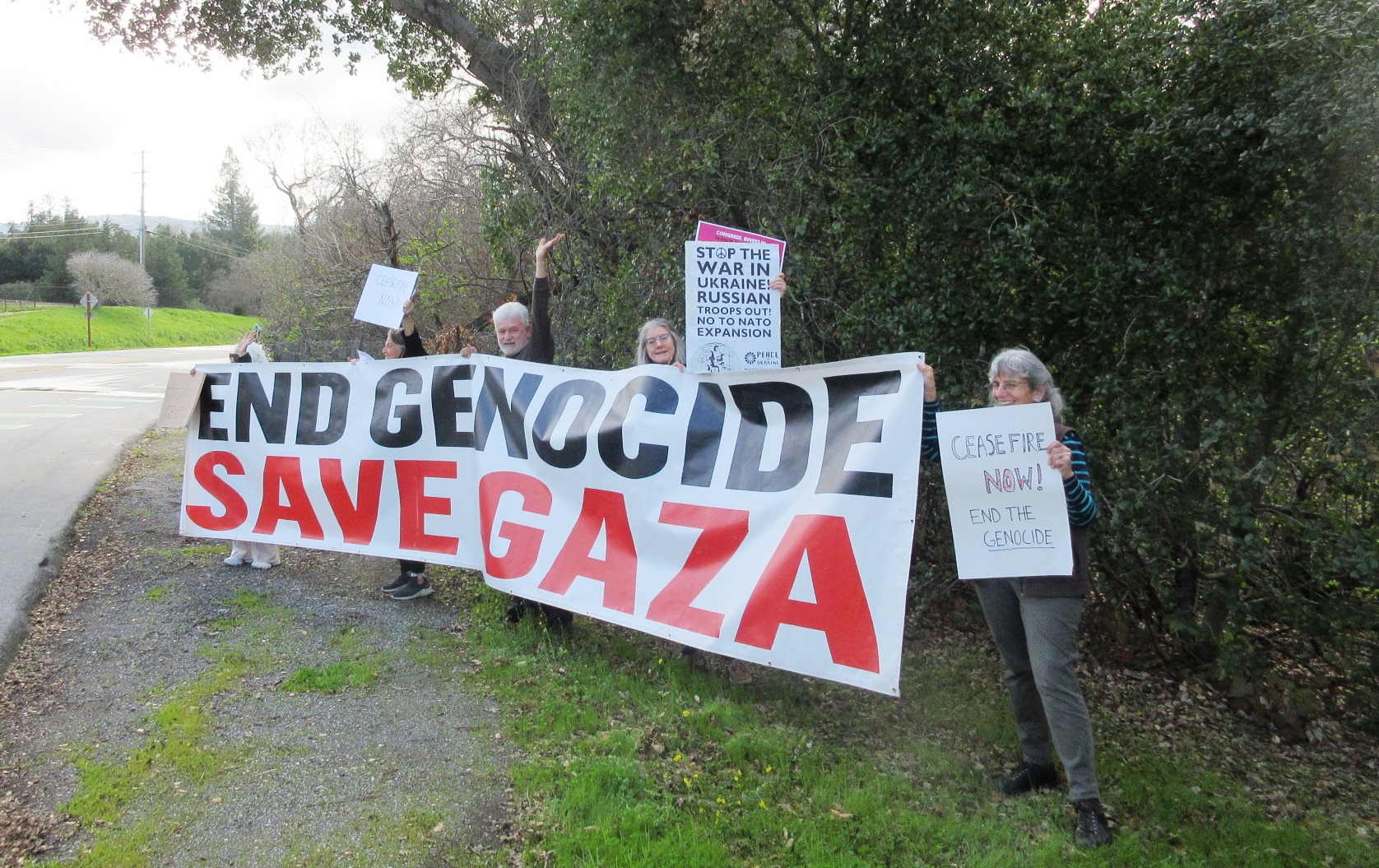 DISARM members have been involved in many Gaza actions since October 7, 2023. Cherrill Spencer and other Palo Alto, CA WILPF members showed their End the Genocide and Ceasefire NOW signs to President Biden as he was driven to and from a nearby fundraising event on February 22.