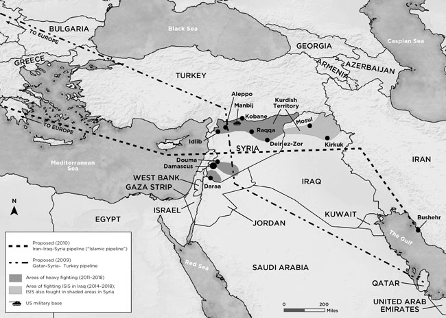 Competing pipeline schemes in Syria are believed to have caused the civil war. Map created by John Van Hoesen. Used with permission of Chelsea Green Publishing.