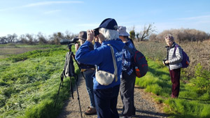 Our first excursion, in March, was to the San Luis National Wildlife Refuge26,800 acres of wetlands, riparian forests, and grasslands. It is an important stop in the Pacific Flyway. We invited Penny Stewart, an expert birder, to come along and point out the cormorants, blue herons, white pelicans, three kinds of hawks, cinnamon teals, and a great-horned owl sitting on a nest who bid us farewell when we completed the trail. Besides the birds, there were many fat, contented Tule elk basking in the sun on their part of the Refuge. The newly-remodeled Visitor’s Center was full of additional information about the many beings who live there.