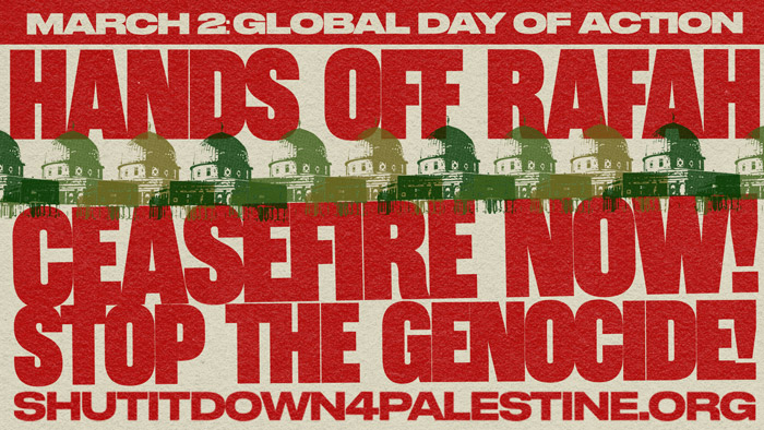On February 20, the US vetoed for the third time a resolution in the Security Council for an immediate, humanitarian cease-fire put forth by Algeria. The UK is still abstaining. A full-scale Israeli invasion of Rafah would be a disastrous escalation of the US-backed genocide with more than 1.3 displaced Palestinians from other parts of Gaza now trying to shelter in Rafah that has little drinkable water, destroyed sewer systems and raw sewage in the streets, starvation, the spread of life-threatening diseases and hospitals destroyed with others on the brink of collapse.