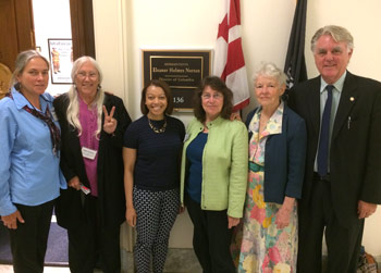 Inset Photo: From left: Joanne Steele, Nuclear Watch South; Ellen Thomas, WILPF US Disarm/End Wars Co-Chair; Lauren Dudley, Legislative Counsel for Congresswoman Eleanor Holmes Norton; Odile Hugonot Haber, WILPF US Mideast Committee Chair; Robin Lloyd, WILPF Disarm/End Wars Co-Chair; Mark Hamilton, Nuclear Age Peace Foundation. Courtesy Ellen Thomas.