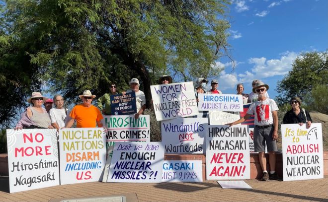 Members of WILPF TUCSON, Veterans For Peace, The Tucson Peace Center, Tucson Raging Grannies and some local churches demonstrated against nuclear weapons at the entrance to the “Davis Monthan” Air Force Base in Tucson, AZ on August 6th, 2024. See photo above. - Washington DC