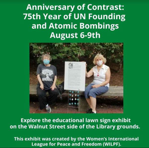 This photo, captioned “Boston WILPFers show one of the educational lawn signs they included in a walking 1945 timeline exhibit outside the Newton, MA, public library,” describes an “outdoor, educational” type of activity. Boston WILPFer Eileen Kurkoski “borrowed” the information in ten of the dates in the online 1945 timeline that three other WILPFers had created (which many of you will have visited here) and placed the photo and text from those 10 dates on 10 lawn sign posters, which she arranged in a walking timeline in the lawn outside her local library. Each poster has strings of peace cranes hanging from them, and at the end of the exhibit, you could pick up a crane pin and a card telling you where to sign our petition supporting the UN Treaty on the Prohibition of Nuclear Weapons and the hibakusha appeal. Eileen has already received requests from other libraries to show this exhibit; it can be shown on an inside wall, too, and Eileen will send you the pdf files if you’d like to display this educational exhibit in your local library or community hall. Kudos to Eileen for this innovative solidarity activity.