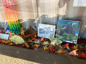 At least eight of our branches have already created public displays of these cranes, in the windows of shops, on cafe tables, on statues, and in trees: Burlington, VT; Corvallis, OR; Des Moines, IA; East Bay, CA; Fresno, CA; Greater Phoenix, AZ; Humboldt, CA, and Peninsula/Palo Alto, CA. Here is a photo of a shop window display of peace cranes arranged by our Corvallis, OR branch taken by WILPF member Leah Bolger.