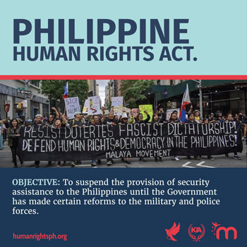 As a result of a plethora of human rights violations in the Philippines, International Coalition for Human Rights in the Philippines US (ICHRP-US), Malaya Movement, Kabataan Alliance, and partner organizations have worked together to advocate and put forward the Philippine Human Rights Act (PHRA). The objective of the PHRA is to “suspend the provision of security assistance to the Philippines until the Government of the Philippines has made certain reforms to the military and police forces” (Philippine Human Rights Act).