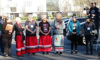 Inset Photo: Indigenous women lead prayers on the first day of the “Oily Wells” march, which started in Palo Alto. Photo: Cherill Spencer.