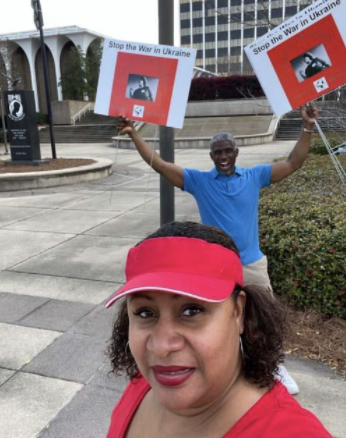 Photo: Danita Gibson Lloyd of Fannie Lou Hamer Branch, Columbus, GA, on March 6. Photo by Theresa El-Amin, on WILPF SMART YouTube channel