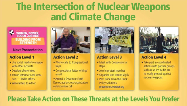 The NuclearBanUS working group has a marvelous tool for keeping track of what Representatives have or haven’t signed the ICAN pledge and co-sponsored H.R. 2850, and how to reach their appropriate staff to persuade them to do so. We hope WILPFers will continue to take part in this ongoing campaign, which evolved in part from the Nuclear Free Future Campaign of Carol Urner, Nuri Ronaghy, and Ellen Thomas from 2009 to 2019. Please write to disarmchair@wilpfus.org if you’d like to join this or any other effort – this is a level 2 activity that you can do from home. “What’s a level 2 activity?” you may well ask. See below: