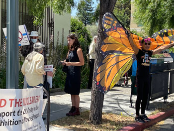 Rallying for the TPNW were four branch members: our local “peace dancer” Sharat Lin in his distinctive, signature butterfly wings (representing the global migratory flight of peace actions); representatives of the local Pacific Life Community/Catholic Worker; a member from the local Multifaith Voices for Peace and Justice group; a seasoned peace activist and his 93-year-old mother; and a Japanese woman who held our “No More Hiroshima’s/Nagasaki’s” sign.