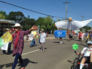 In other news, while on a road trip I participated in a parade in Silverton, OR, near Hiroshima Day. Local peace group participants included WILPFers and members of Veterans for Peace and Fellowship of Reconciliation. In the photo, I’m in the center flashing the peace sign in front of the FOR sign and the Dove.