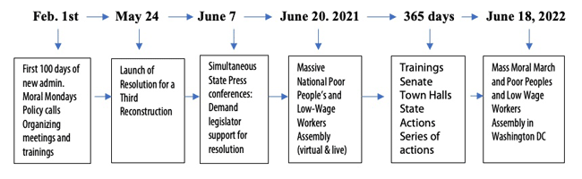 What is 500 Days of Fighting Forward? A nationally coordinated campaign from February 1, 2021 to June 18, 2022 is aimed at changing the fundamental system that perpetuates the five interlocking injustices, not incremental or piecemeal solutions. It isn’t just a series of rallies and actions but a moral fusion organizing and mobilizing strategy aimed at changing the narrative and building power through several pulling points: