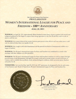 THEREFORE, be it resolved that April 28, 2015, the 100th anniversary, be designated by the city and county of San Francisco and Board of Supervisors, Women’s International League for Peace and Freedom Day.