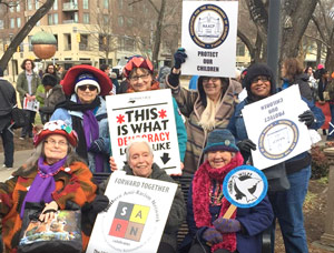 From left, Triangle WILPF members Mary Jenne, Jean Chapman, and Fran Schindler at the HKonJ March in Raleigh, NC, on February 9, 2019. Photo credit: Emily Keel (WILPF).
