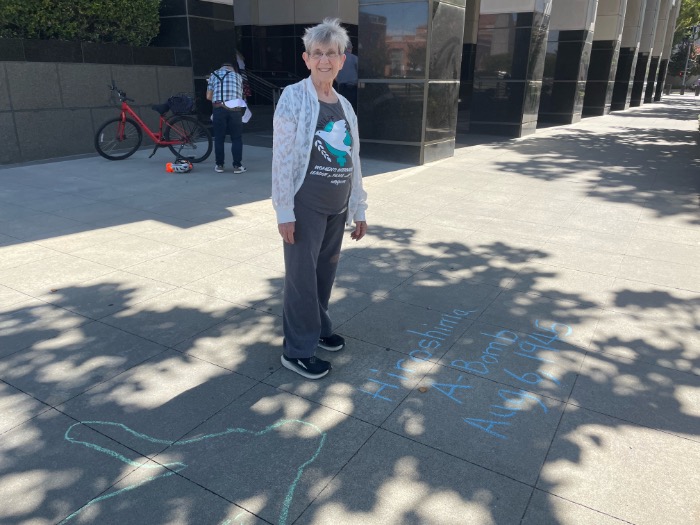 The “Shadow Project” was initiated from a post on the Branches Listserve by Robin Lloyd, reminding members of WILPF’s long-standing commitment to nuclear disarmament. Branch members quietly assembled in front of the enormous federal courthouse, where they chalked a message about the 80th anniversary of the bombing and traced the outlines of “the dead” on the ground. They departed—with their message in place—after building security informed them that they were “defacing federal property.” The members understood that arguing with security about how the actions of the president and Congress could also be seen as “defacing public properties” was futile.