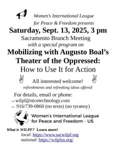 WILPF’s Sacramento branch members learned about Theater of the Oppressed at a recent meeting. These theater techniques can be used for political education, experimentation, and practical application at actions.
