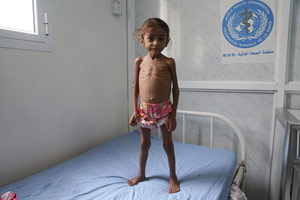 Photo: Kholod, 3 years old, stands on a hospital bed at Al Thawra Hospital in Al Hudaydah, Yemen, in April 2017, shortly after being admitted to the pediatric ward for severe acute malnutrition. One of five children, her father is a teacher in a local school but he had not been paid in months. According to UN figures, nearly 2.2 million Yemeni children are acutely malnourished and an estimated 462,000 children suffer from severe acute malnutrition in Yemen today, a nearly 200% increase since 2014. Giles Clarke/UN OCHA.