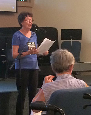 Above photo: Jean Hays speaking at the premiere. Credit: WILPF Fresno Earth Democracy Facebook page.