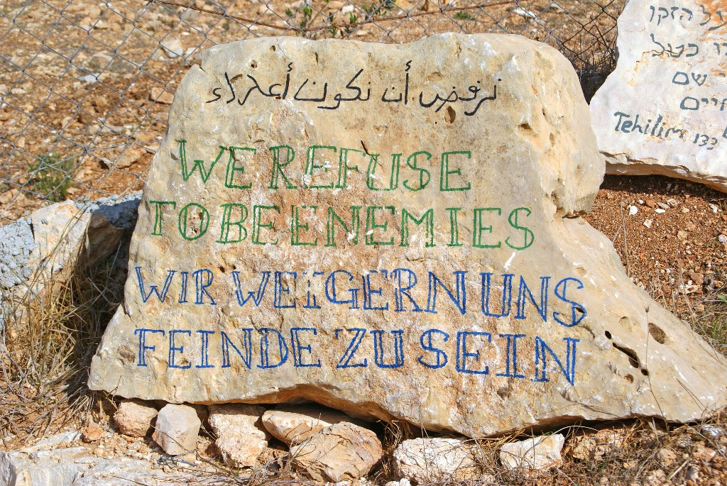 Welcome message as you enter the 100-acre organic farm used for the Tent of Nations; Credit: Jan Corderman