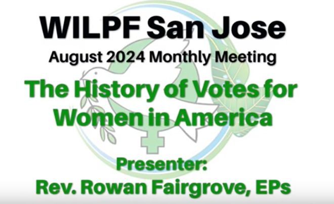 In anticipation of the 2024 election, WILPF San Jose member Rev. Rowan Fairgrove offered a two-part talk about the history of women’s suffrage in America. As always, our monthly meeting videos are posted to our YouTube channel.
