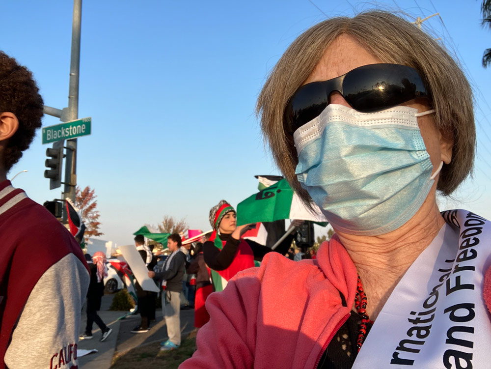 Leni Villagomez Reeves repping Women’s International League for Peace and Freedom at a Fresno demo for peace and freedom in Gaza and Palestine. Credit: Leni Villagomez Reeves