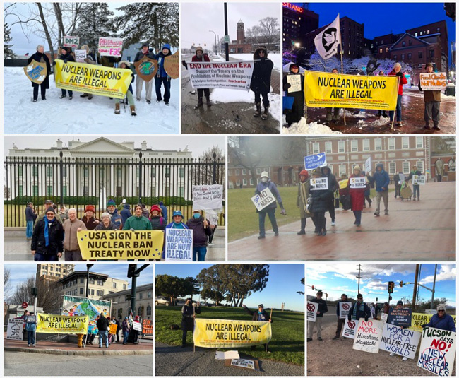 See photo at the top of this article. On Sunday, January 22, 2023, the group attempted to deliver a letter to President Biden in hardcopy but the guards at the White House gate wouldn’t even touch the envelope, so it was sent by email. The letter had been signed by over 100 national, state, and local organizations and calls on the President to sign the Treaty on the Prohibition of Nuclear Weapons (TPNW or “Nuclear Ban Treaty”).
