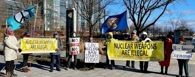 Our enthusiastic members braved the snow and rain to celebrate the entry into force (EIF) of the Treaty on the Prohibition of Nuclear Weapons (TPNW) and to inform their communities about it as part of the ongoing WILPF US Call for Peace Campaign.