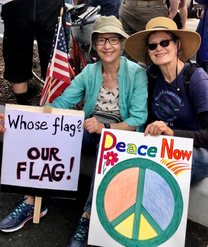 Cherrill Spencer (left) and Martha Murari (right) joined 20,000 others, including other WILPF members, at the “No Kings” protest in Palo Alto, CA. Photo submitted by Cherrill Spencer.