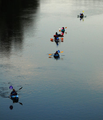 Photo (above): Canoes with lanterns paddle along the Willamette River in Corvallis, Oregon in a Hiroshima event co-organized by the Corvallis WILPF branch. Photo by Bart Bolger, used with his permission.