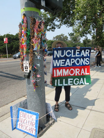 Photo (above): Garlands of peace cranes adorn a light pole at Peninsula/Palo Alto vigil on 6 August. Photo by Cherrill Spencer, used with her permission.