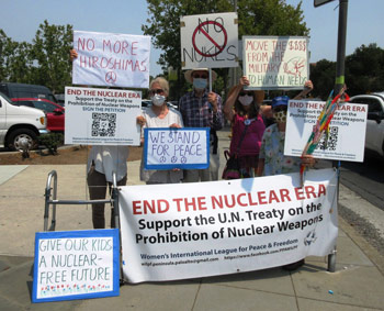 Photo (left): Some of the Palo Alto/Peninsula WILPF branch members who stood in vigil on 6 August. Photo by Cherrill Spencer, used with her permission.