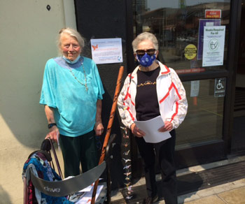 Photo (left): Deetje Boler and Anne Politeo leafleting in San Francisco’s Japan Town on 6 August. Photo by Betty Traynor, used with her permission.