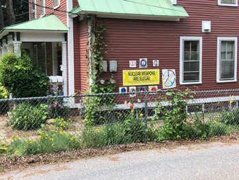 Photo (above): DISARM Co-chair Robin Lloyd, decorated the side of her house in Burlington, VT, with banners and paintings by local school children