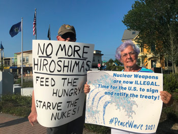 #PeaceWave_2021_Maine was held on Friday Aug 6 on the Brunswick Green in Maine to Commemorate H&N, to collect signatures for the petition calling on President/Senate to sign & Ratify the TPNW, to collect words & stories from those persons present, and to educate ourselves about the #TreatyBan TPNW, and to read excerpts from the Ban Treaty text. There is an 8 minute video of the Maine branch event on You Tube, watch here: https://youtu.be/pJCyjGRSzRI