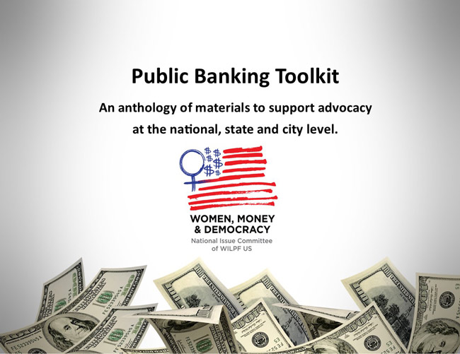 This collection of information is the work product of the Women, Money & Democracy Committee of WILPF US, and it’s a FREE download, because we want the Public Banking Toolkit to be used widely, without limitations or fees.